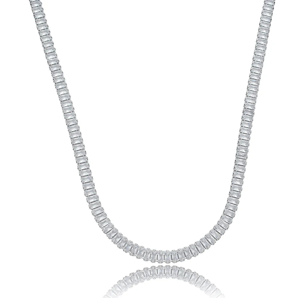 Colar clássico com design em ouro e pedrarias retangulares cravejadas em toda a extensão, proporcionando um brilho intenso e sofisticado. Uma peça versátil que combina elegância e modernidade para qualquer ocasião.
